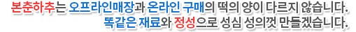 선물떡 답례떡 예단이바지 떡케익 돌/백일/행사 일반떡 수능찹쌀떡 모시떡 한방약초떡 Customer Center예약/문의 전화 정성가득 본춘하추031-707-4948010-2701-4948010-8862-4948 온라인문의 바로가기 ▶ Account Number입금계좌안내 (예금주: 홍미숙)1005-103-193513 안녕하세요?본춘하추입니다.방문을 환영합니다.문의사항은 언제든지 문의주세요.(홈페이지와 전화 모두 가능합니다.) 본춘하추 공지사항새로운 소식을 전해드립니다. 오시는길찾아오는 길을 안내합니다. 본춘하추 소개 확장이전 1 전통먹거리를 격려해 주시는 조정래선생님 방문 대한민국을 빛내는 KLPGA 선수와 함께하는 본춘하추떡집 일반떡 모듬찰떡 수리취인절미(식사용~품절) 두텁편 구름떡 답례떡 신상 답례떡 상자 4구정사각 바람 감사8호 수빈8호 예단이바지 본춘하추 이바지,예단떡에 대하여 예단,이바지 보자기 포장구성에 대하여 ** 은빛예단 C호(구름떡예단)최고 히트상품** 봉황이바지 수 (품절) 돌/백일/행사 5색송편 출시 수수팥떡 꿀설기 첫돌설기 출시 떡케익 찰떡+설기케익 석탄병 캘리 축생일 케익 생신을 축하드립니다.단호박장미케익 백설기 생일 장미케익 본춘하추 선물세트 추석선물세트 1호2단세트 (모듬영양찰떡과 4색송편) 선물떡(히트상품) 춘하10호 여우비선물E세트(히트상품) 기업행사케이크 신세계 백화점 82주년 기념행사케익 cj그룹 행사케익 유니소재 창립30주년행사케익 성남도시개발공사 3주년 찹쌀선물떡 수능대박기원A세트 수능대빅기원B세트 수능찹쌀떡A세트 한과, 폐백, 이바지음식포장구성 및 색상에 대하여 고급떡케익,선물떡 보자기 떡을 담는 복주머니 ^^ 본춘하추 떡의 색상에 대하여 이바지 상자 설날선물세트